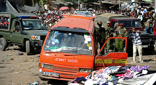 Policemen inspect the scene of an explosion in Gikomba on the outskirts of Nairobi's business district where twin blasts claimed at least ten lives on Friday. PHOTO/AFP