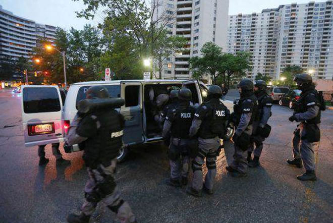 STEVE RUSSELL / TORONTO STAR Order this photo - Last June, police wearing tactical gear raided three highrises in the enclave known as Dixon City. Roughly 50 people were arrested in the Project Traveller raids