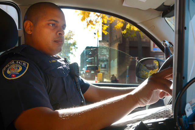 Metro Transit officer Salah Ahmed checks his computer for updates in the Cedar Riverside neighborhood Tuesday afternoon. Ahmed, who is the vice chairman Somali American Police Association, has been an officer for Metro Transit since July of this year.