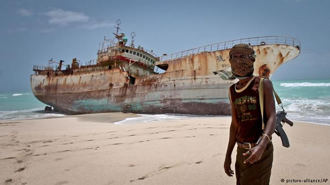 Somali pirate stands near a hijacked fishing vessel, September 2012.