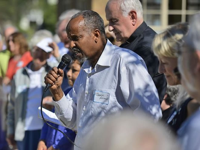 Jama Alimad, a Muslim and organizer with the Greater St. Cloud Interfaith Leaders, addresses the group gathered for an interfaith picnic Sunday at Lake George.