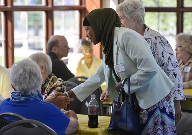 Anab Dahir, center, circulates during the interfaith picnic Sunday at Lake George. (Photo: Kimm Anderson, [email protected])