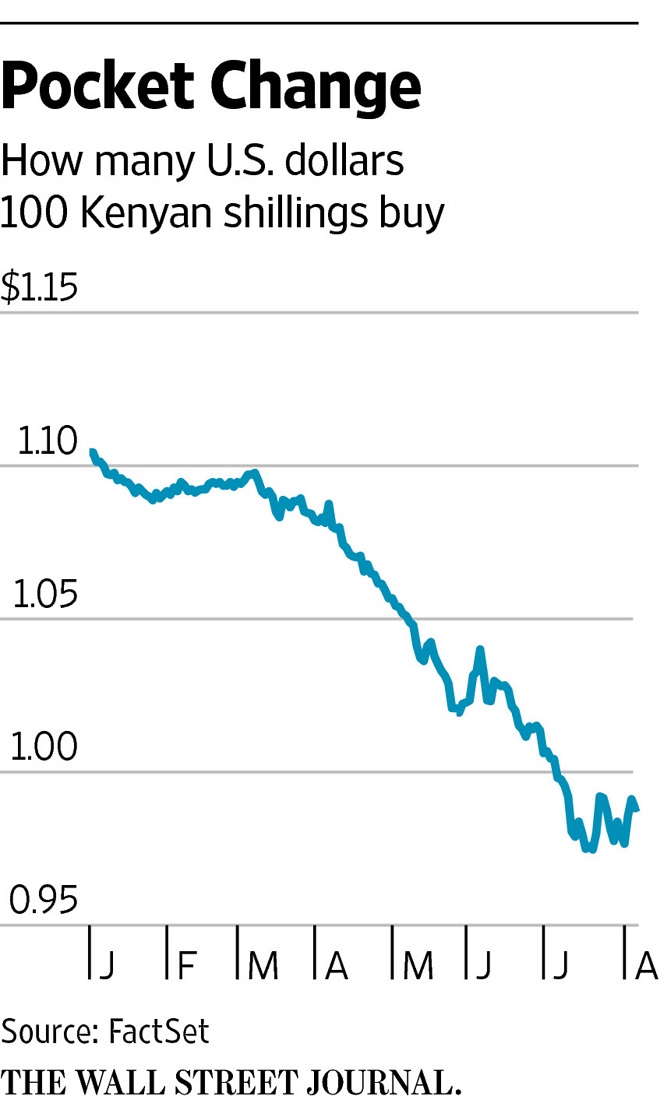 Glow of Obama visit fades amid concerns about falling currency, economy and secukjrity Kenya has been hit by a glut of woeful news that is spotlighting the economy’s fragility, after a week of touting its credentials as a regional powerhouse during President Barack Obama’s visit. Currency tumult and security concerns in what is considered one of Africa’s most dynamic countries shows how the continent continues to struggle against swift and unpredictable changes in economic thrust and investor sentiment. Kenya’s currency, the shilling, has shed nearly 11% of its value against the dollar this year. The central bank on Wednesday maintained its tight monetary policy, holding rates at 11.5%. The bank said rate increases of a total of three percentage points in June and July had yet to fully feed into the pricing of the currency. The tumbling shilling and surging inflation are spelling trouble for Kenyan households. Some staples cost 20% more now than at the beginning of the year, according to the national statistics bureau. “I’m spending more than I used to a few months ago for less,” said Joyce Kinoti, a mother shopping for baby food at the discount Uchumi supermarket in Nairobi’s Westlands, a bustling commercial area. To be sure, currencies have fallen further in African petro-economies hit by sliding oil prices like Nigeria and Angola. But Kenya is a net energy importer, meaning it can’t blame its woes on lower global oil prices. A shaky domestic economy is the culprit.