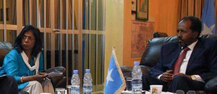 United Nations Under Secretary General for Field Support Ameerah Haq (left) at a meeting with Somali President Hassan Sheikh Mohamoud (right) in November, 2014 at Villa Somalia in the capital Mogadishu