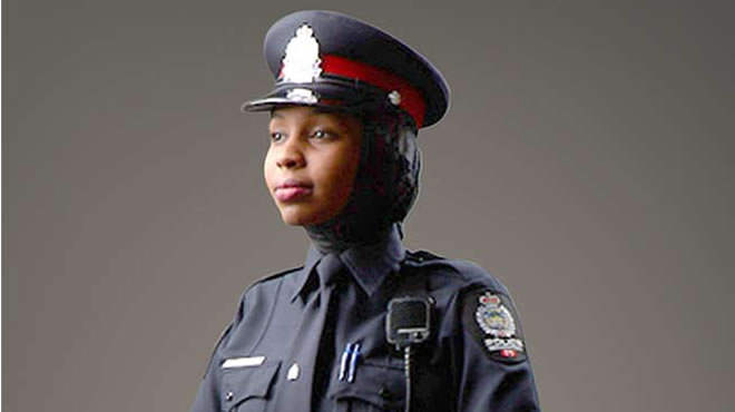 A model wears a special Edmonton Police Service uniform with a hijab, or head scarf.