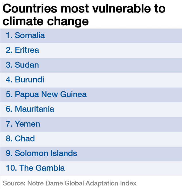 Somalia is the country most vulnerable to the impact of climate change, according to Notre Dame University’s Global Adaptation Index.The index assesses 177 economies on how well they can adapt to climate change, including their readiness and vulnerability. The report measures vulnerability based on exposure, sensitivity and ability to react to climate change and has a number of sub-indicators measuring the vulnerability of food, water, health, ecosystems, human habitats and infrastructure.