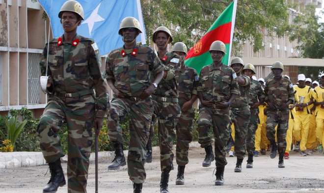 Somali military march at a Ministry of Defense compound during celebrations on the 55th anniversary of the Somalia force in Mogadishu, Somalia, Sunday, April 12, 2015. © AP Photo/Farah Abdi Warsameh