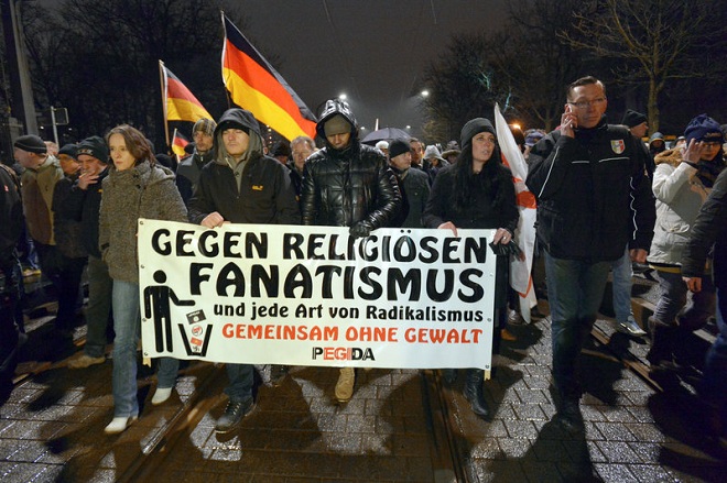 Supporters of the right-wing group PEGIDA hold a banner that reads "Against religious fanaticism and any kind of radicalism — Together without violence" as they march during a rally Monday in Dresden, Germany.