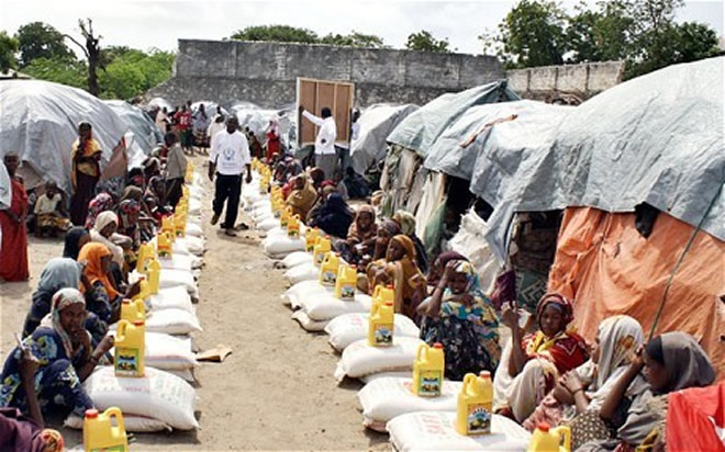 Internally displaced Somali women receive food-aid rations at a distribution centre, in an IDP camp in the Somali capital Mogadishu