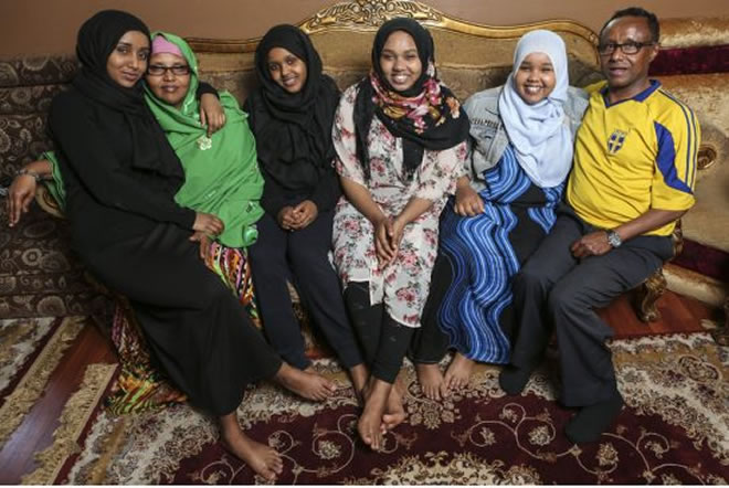 From left, Idil Abukar, 17, mom Asha Mohamed, and sisters Ibada Abukar, 19, Maymun Abukar, 21, and Munira Abukar 22, with father Aden Abukar at their North Etobicoke home - David Cooper / Toronto Star.
