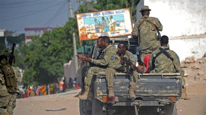 Somali soldiers patrol in a pickup truck near the site where al-Shabab militants carried out an attack against a military intelligence base in Mogadishu on June 21, 2015. (AFP photo)