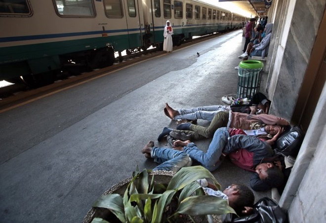Migrants rest on the platform of Ventimiglia railway station, near the Italian-French border, June 18, 2015.REUTERS/Eric Gaillard
