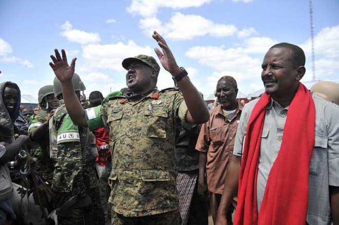 Brig. Sam Kavuma. the Sector One Commander, who is also the commander of the Ugandan troops,flanked by The Governor of Lower Shabelle, Abdulkadir Mohamed Siidi, addresses residents of Tortorow, Somalia after the town was captured from the extremist group Al Shabab.
