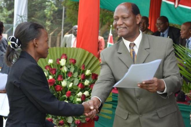 Moi University VC Richard Mibei gives a scholarship to one of the Garrissa Students on June 17th