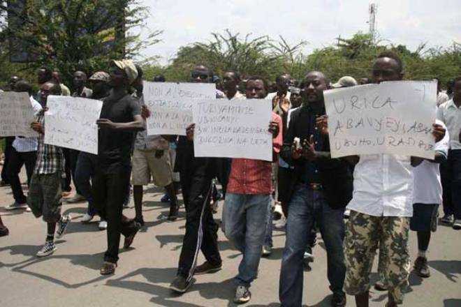 People hold placards as they demonstrate during the funeral of a Burundian journalist and his family and a member of the International Organization for Migration in Bujumbura on October 20, 2015, after they were shot dead. A UN employee was among those killed in Burundi at the weekend. AFP PHOTO | LANDRY NSHIMIYE