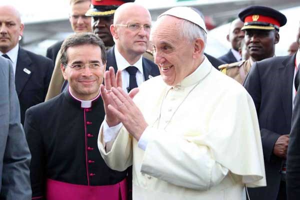 Pope Francis smiles and waves at Kenyans when he arrived at the Jomo Kenyatta International Airport on November 25, 2015 as he starts his three-day tour. PHOTO | JEFF ANGOTE | NATION MEDIA GROUP