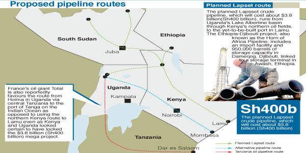 The firm favours the route from Hoima in Uganda via central Tanzania to the port of Tanga on the Indian Ocean as opposed to using the northern Kenya route to Lamu even as Kenya and Uganda looked certain to have locked the $3.8 billion (Sh400 billion) mega project.