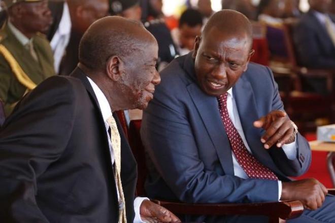 Deputy President William Ruto chats with Uganda vice president Edward Ssekandi during celebrations to mark the country's 53rd independence day anniversary, at Kaunda grounds in Gulu district