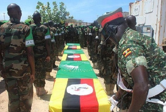 Yesterday, flag-covered coffins of 12 fallen Ugandan soldiers were offloaded from a UN plane at the country’s Entebbe International Airport.