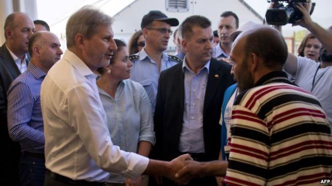 Commissioner for European Neighborhood Policy Johannes Hahn shakes hands with a migrant at a camp near Gevgelija
