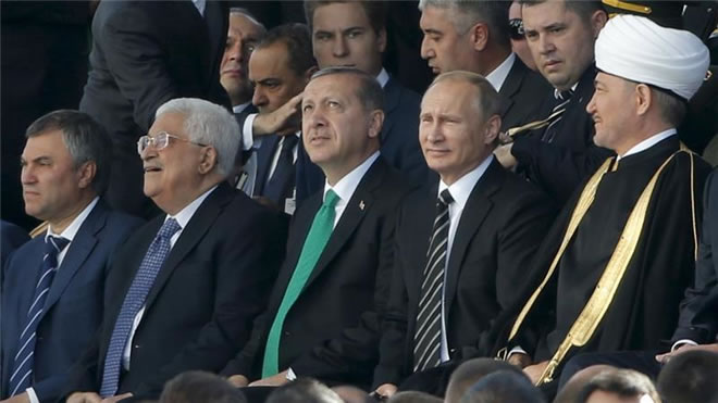 Russian President Vladimir Putin has been joined by the Turkish and Palestinian leaders at the ceremonial opening of the Russian capital's new main mosque after 10 years of construction work.