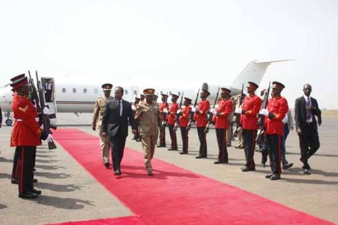 Somali President Hassan Sheikh Mohamoud inspects a guard of honour at the Eldoret International Airport on January 27, 2016. Somalia leaders agreed on an electoral process for a Parliament composed of an Upper and a Lower Houses or a House of Representatives after a three-day conference on April 12, 2016 in Mogadishu. The elections will be held in 2016. PHOTO | CHEBOITE KIGEN | NATION MEDIA GROUP