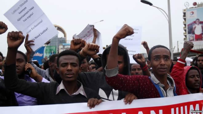 Protesters chant slogans during a demonstration in Ethiopia's capital Addis Ababa, Aug. 6, 2016.