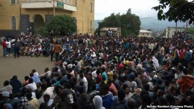 FILE - Protesters are seen gathered in Gonder, in the Amhara region.