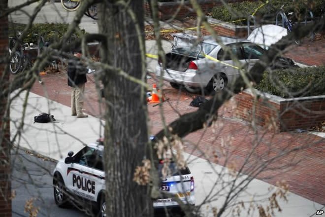 A car sits inside a police line as authorities respond to an attack at Ohio State University, Nov. 28, 2016, in Columbus, Ohio. A man plowed his car into a group of pedestrians and began stabbing people before he was shot to death by a police officer.