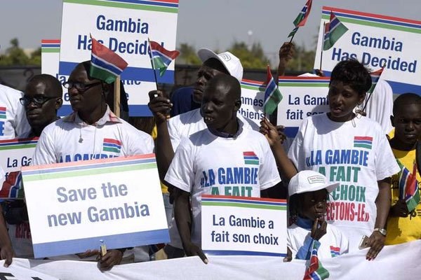 People hold placards reading "Gambia made its choice, save democracy in Gambia, save the new Gambia" during a protest in support of Gambia by Senegalese NGOs and civil rights groups in Dakar on December 17, 2017. PHOTO | SEYLLOU | AFP