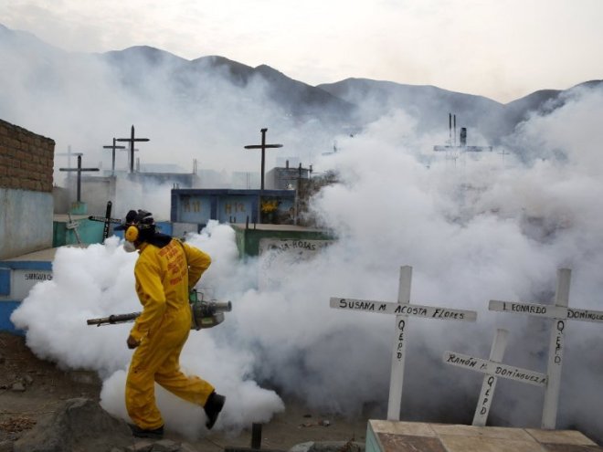 A health worker carries out fumigation as part of preventive measures against the Zika virus and other mosquito-borne diseases at the cemetery of Carabayllo on the outskirts of Lima, Peru February 1, 2016. Photo/REUTERS