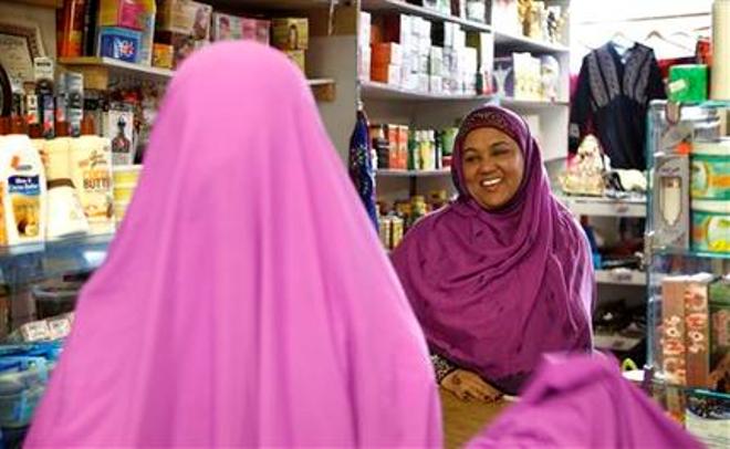 In this Tuesday, Jan. 26, 2016 photo, Shukri Abasheikh, owner of Mogadishu Store, speaks with a customer in Lewiston, Maine. "When Somalis came in, Lewiston people, Maine people, they think they need welfare but we don't need welfare. We need jobs. We need peace. We need education," said Abasheikh, who worked as a janitor before achieving her dream of running her own business. (AP Photo/Robert F. Bukaty)