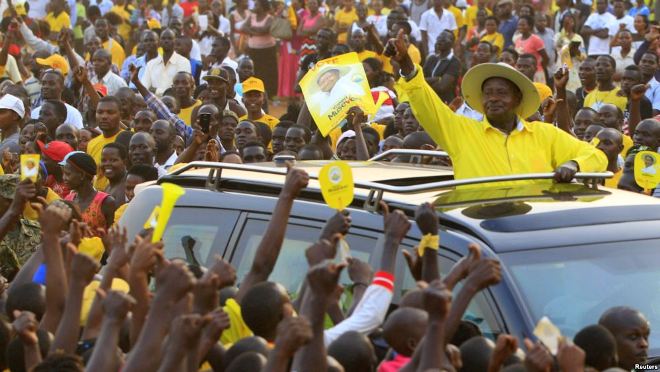 Uganda's President and the presidential candidate Yoweri Museveni of the ruling party National Resistance Movement (NRM) waves to his supporters as he arrives at a campaign rally ahead of the February 18 presidential elections in Entebbe, Uganda Feb. 10, 2016.