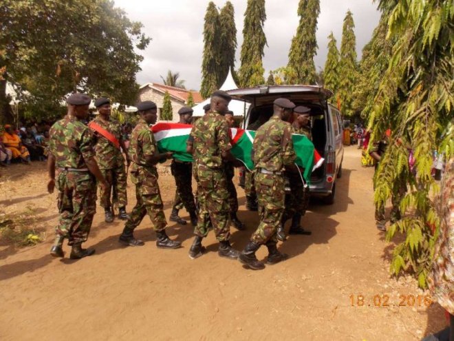 A Kenya Defence Forces soldier killed during the El Adde attack in Somalia on January 15 was buried on Thursday at Kwachocha in Malindi town, Kilifi county.Private Amani Lwembe, 26, was among those murdered by al Shabaab insurgents in one of the major attacks targeted at African Union Mission to Somalia troops.