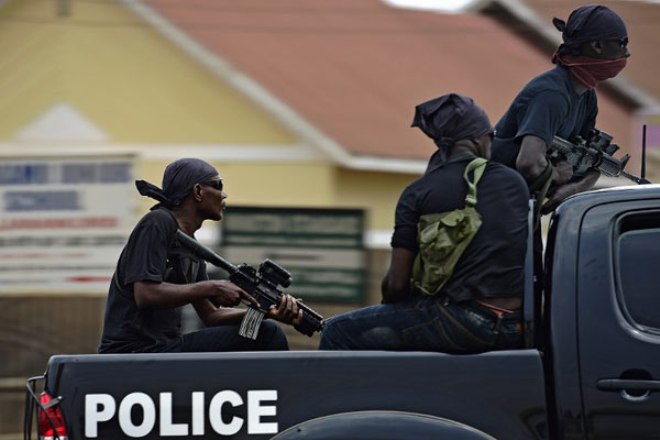 Members of a special unit of Uganda's police force patrol after the end of demonstrations supporting opposition leader Kizza Besigye in Kampala on February 19, 2016. PHOTO | CARL DE SOUZA | AFP