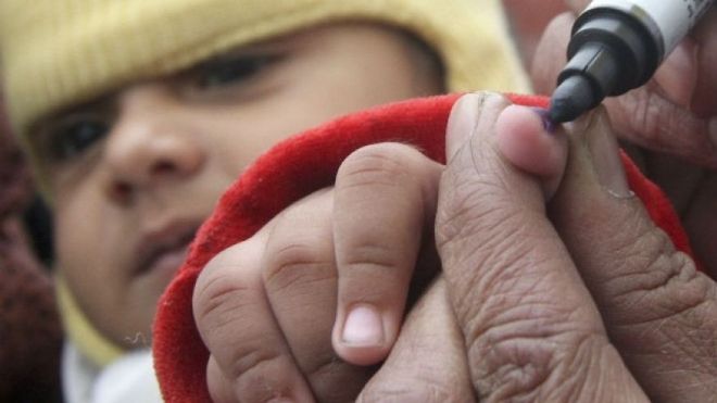 A health worker marks the finger of a child after administering a polio vaccine at a polio booth in the northern Indian city of Chandigarh January 10, 2010. (REUTERS/Ajay Verma)
