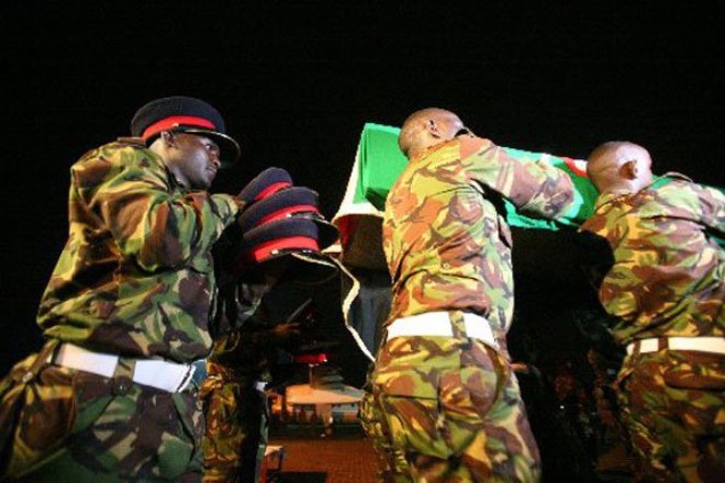 Bodies of some of the KDF soldiers killed when Al-Shabaab attacked their camp in Somalia on January 15, 2016 are received at Wilson Airport in Nairobi on January 18,2016. PHOTO | EVANS HABIL | NATION MEDIA GROUP