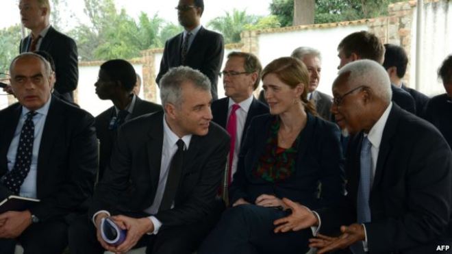 US ambassador to the United Nations Samantha Power (2nd R) speaks with other UN Security Council ambassadors on January 22, 2016 during a meetying with the Burundian President at his residence outside Bujumbura.