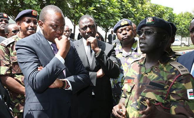 President Uhuru Kenyatta, Deputy President William Ruto and Chief of Defence Forces Samson Mwathethe. A team tasked with probing the attack on KDF soldiers in Somalia has started its work. [Photo: File]