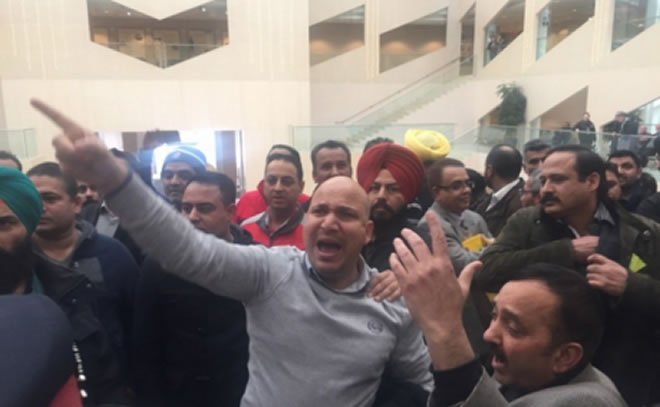 "We want to be let in," cry cab drivers who were ejected from council chambers after a protest at city hall Tuesday. (Laura Osman/CBC)