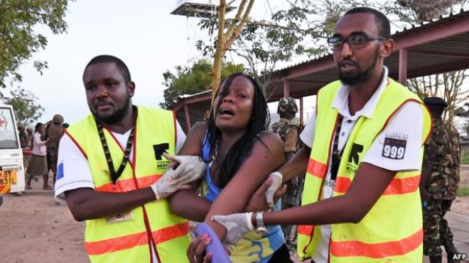FILE - Paramedics help a student who was injured during an attack by Somalia's al-Qaida-linked al-Shabab gunmen at Garissa University College, Kenya, April 2, 2015.