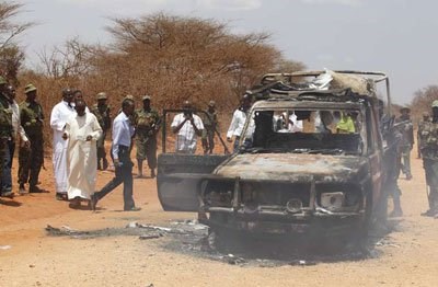 Wreckage of a vehicle that was bombed in Lafey, Mandera County, on March 13, 2015. Seventeen police officers narrowly escaped a landmine explosion in Mandera on June 4, 2016. PHOTO | MANASE OTSIALO | NATION MEDIA GROUP