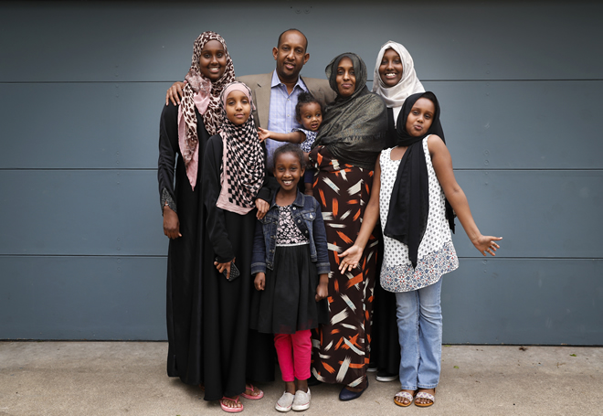 Ahmed Muhumud, center, and his wife and 6 daughters, from left, Ashwaq Abdirahman, 13, Amira Abdirahman, 11, Salma Abdirahman, 7, Azhar Abdirahman, 14 months, Halimo Haji, mother, Asmaa Abdirahman, 14, and Asra Abdirahman, 8, photographed on Friday, May 12, 2016, in Bloomington.