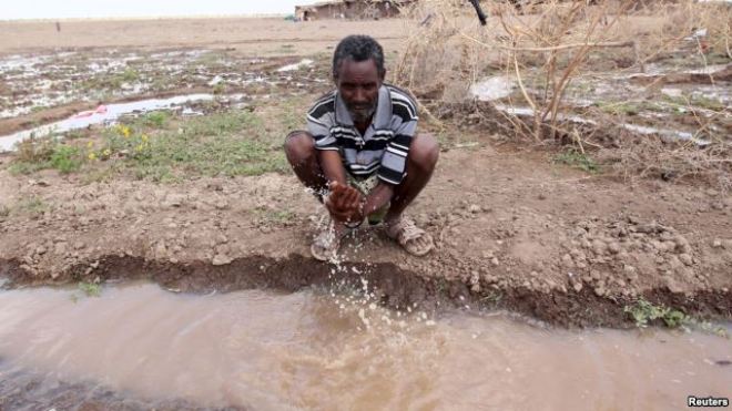 A man washes his hand with running water from a dug-out-trench in the drought stricken Somali region in Ethiopia, January 26, 2016.