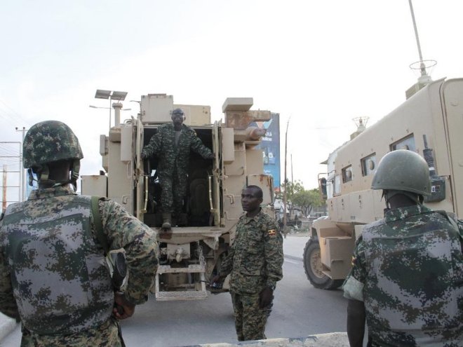 Amisom troops from Uganda UPDF disembark from a military track during an operation in Mogadishu town. Photo/Monicah Mwangi