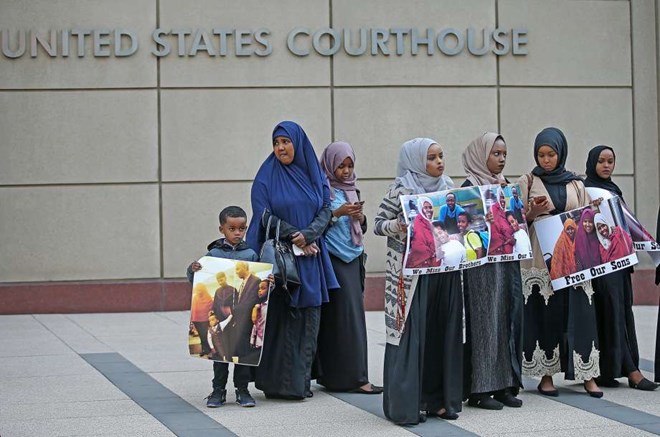 Supporters and family members of Somali men standing trial rally for a protest in front of the United States Courthouse, Monday, May 9, 2016 in Minneapolis. Six defendants have pleaded guilty to conspiring to provide material support to the Islamic State group. Three defendants have pleaded not guilty. Another man is at large, believed to be in Syria. (Elizabeth Flores/Star Tribune via AP) MANDATORY CREDIT