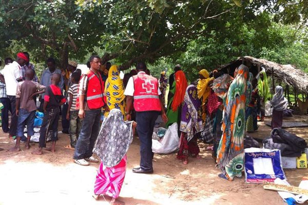 Kenya Red Cross officials attend to families that fled their homes in Milimani and Basuba in Lamu County for fear of attacks by Al-Shabaab terrorists in 2015. The Boni people have been urged to take-up farming to avert a hunger crisis since Operation Linda Boni has disrupted their hunter-gathering lifestyle. PHOTO | ATHMAN OMAR | NATION MEDIA GROUP