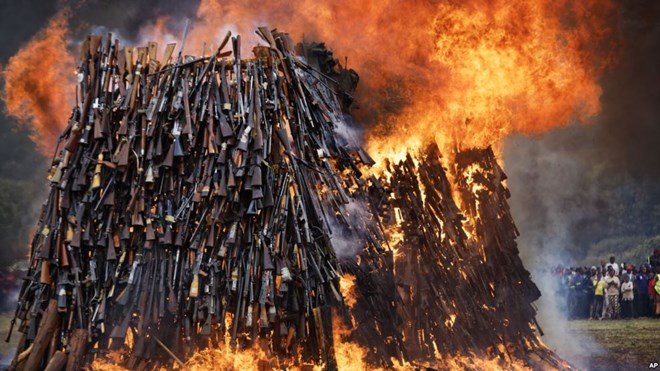 Deputy President William Ruto presided over the burning of rifles and pistols in three stacks about 15 feet high. They were recovered in this East African country over the past nine years, Ruto said.