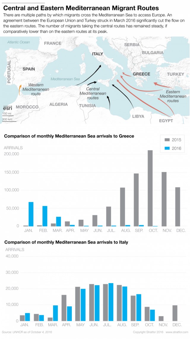 Though these paths are less traveled than the eastern routes, they are no less treacherous. Most deaths among migrants who headed across the Mediterranean this year occurred along the central route. To address the problem, the European Union is trying to negotiate agreements with the countries from which the migrants travel, much as it did with Turkey earlier this year. But the arrangements will only be as effective in constricting migrant flows as are the governments of the North African countries from which they depart.