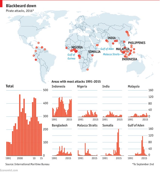 PIRATES, the scourge of the high seas, were mostly kept at bay during the first half of 2016. According to the International Maritime Bureau’s Piracy Reporting Centre, there were 98 attacks worldwide in the six months to July, the lowest figure in 21 years. Indonesia’s waters remained the most pirate-infested in the world.
